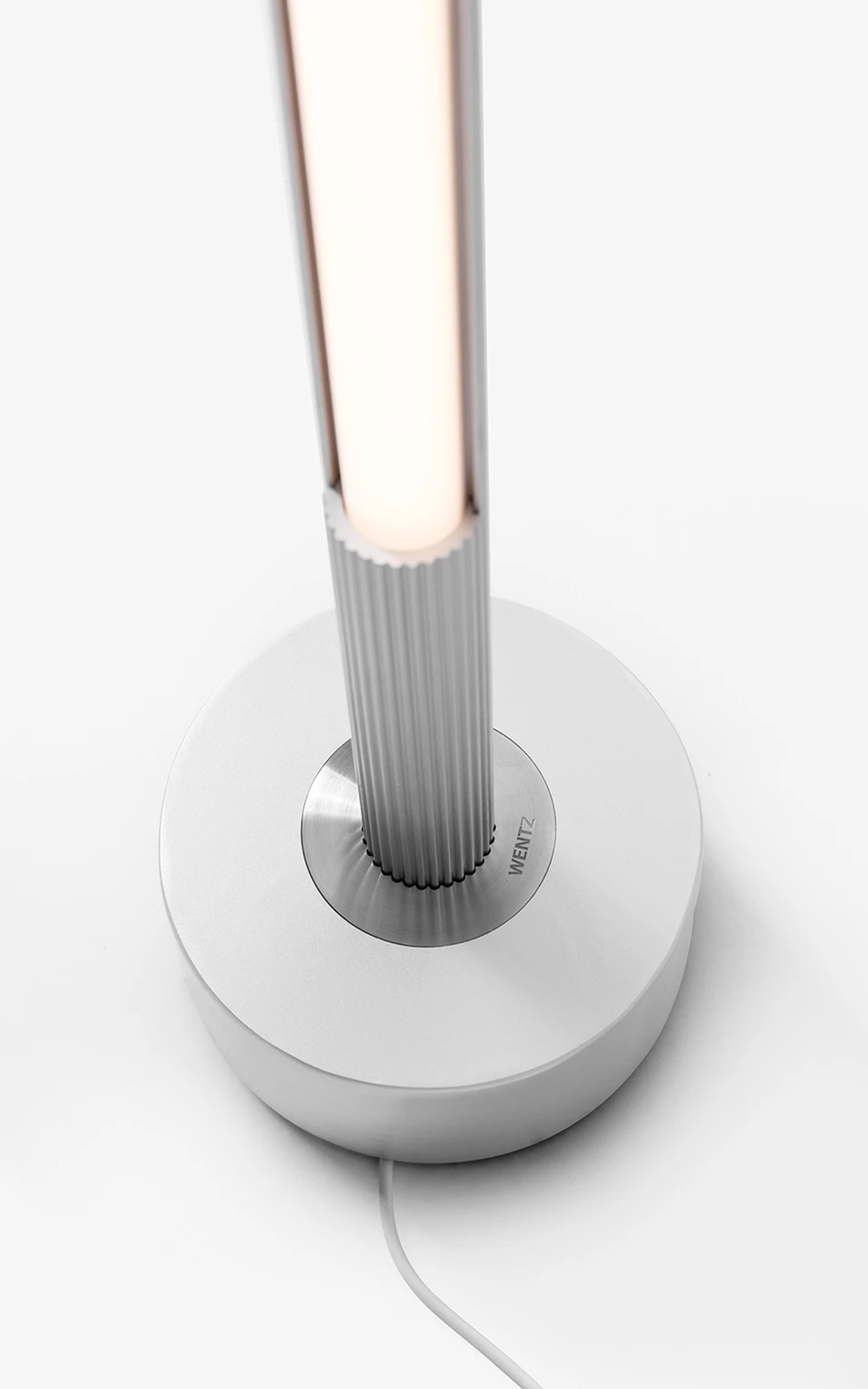 Luminária de piso com luz difusa. Estrutura em alumínio extrudado. Base em aço usinado com capa de alumínio e detalhe em aço inox. Acabamento em pintura líquida (versão Alumínio) ou pintura eletrostática (versão Preto). Difusor de acrílico extrudado. LED integrado.