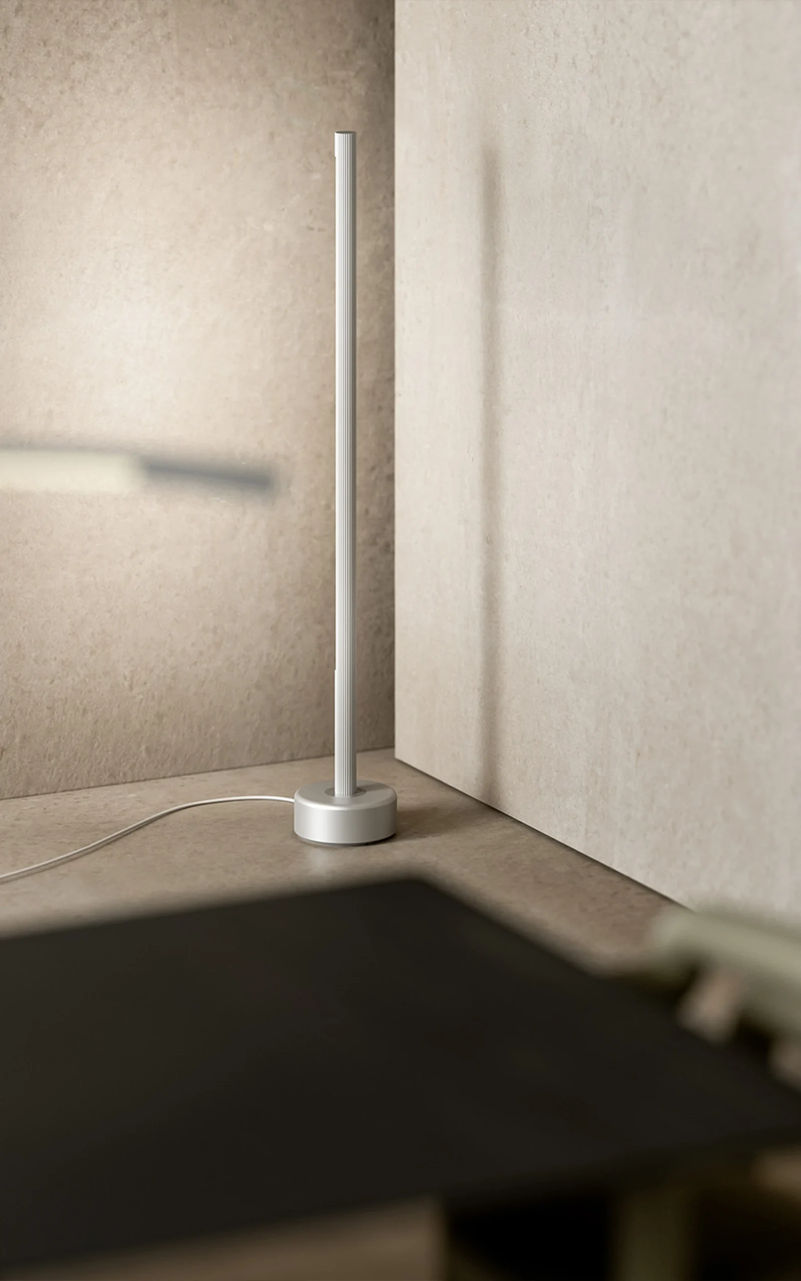A luminária de piso Palo mantém a leveza e a textura de sua versão pendente. Por emitir uma luz difusa, a peça pode ser usada diretamente ou com rebatimento: tudo depende da atmosfera desejada. Seu grande diferencial, que acaba por imprimir maior naturalidade à peça, é a textura. O metal é delicadamente rugoso, resultado de uma técnica de extrusão em que o calor e a ação alteram o alumínio.