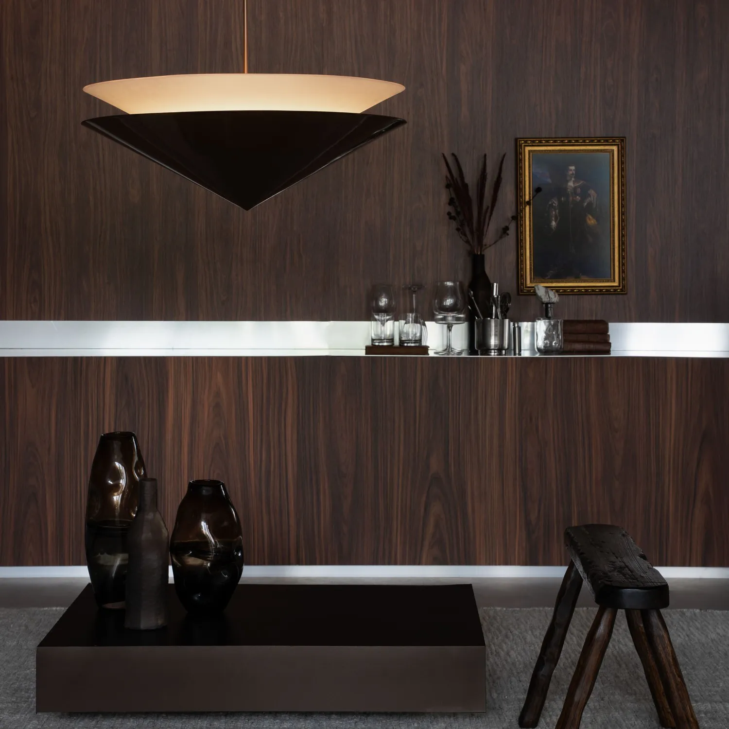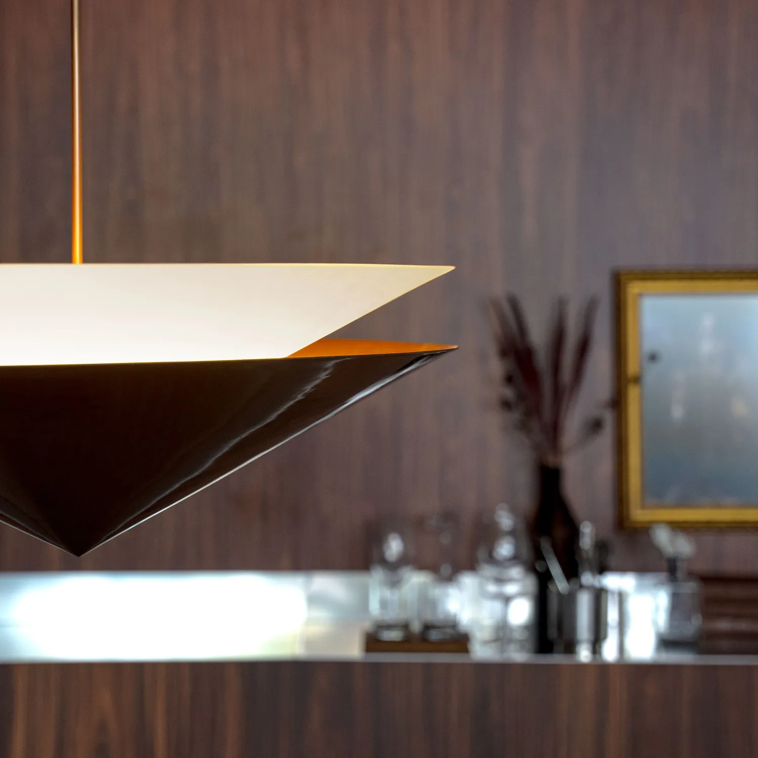Pendente com formas geométricas precisas e acabamento sofisticado em metal e acrílico. Sua composição de linhas opostas cria um elegante contraste entre luz e sombra, trazendo personalidade e presença ao ambiente.