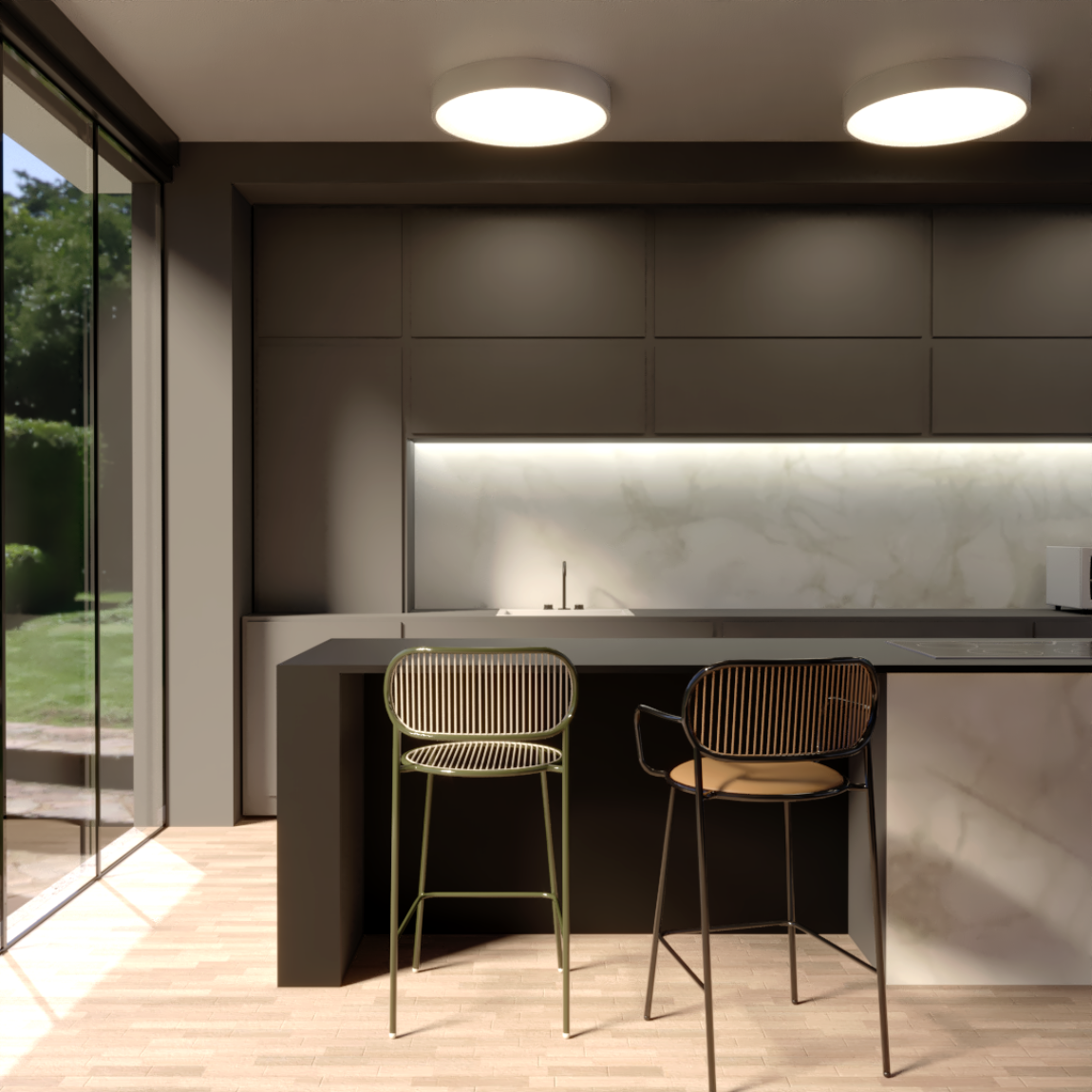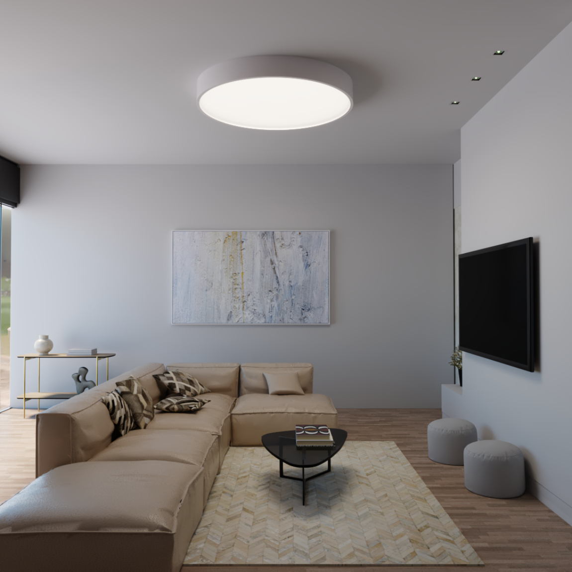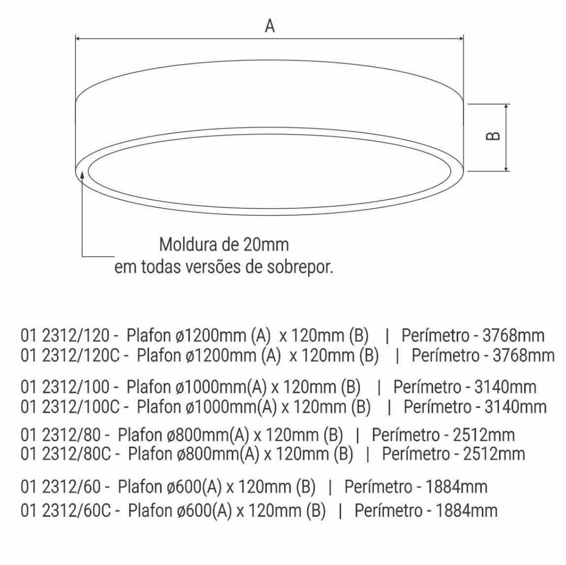 Luminária redonda de sobrepor em alumínio pintado por processo eletrostático e/ou vinílico. Difusor leitoso que permite uma luz difusa e agradável, sem ofuscamento. Possui moldura de acabamento de 20mm. Luminária componível com vários tipo iluminadores.01 2312/120 – Plafon ø1200 (Epóxi)